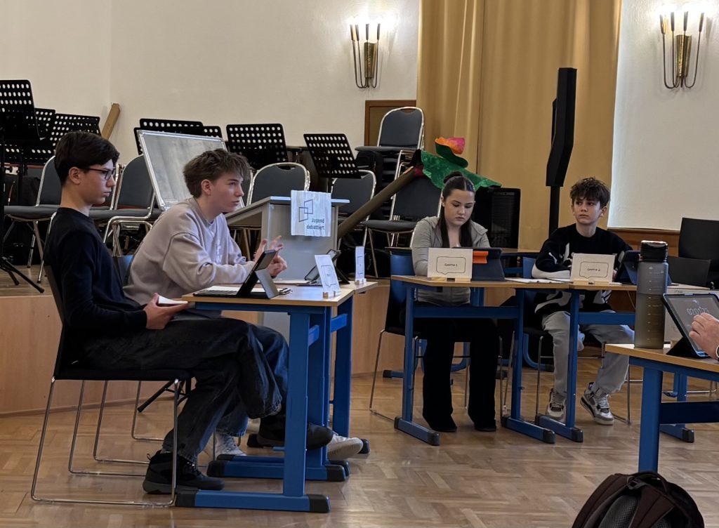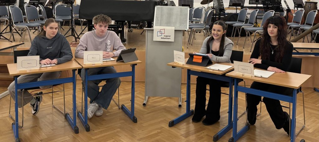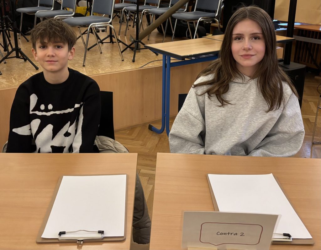 Den Anfang machten die Schülerinnen uns Schüler der Jahrgangsstufe 9. Für die 9b trat Zoe Riddle an, für die 9c Laura Fuchs, für die 9d Ioli Giannakoudi und für die 9e Benjamin Winkler. In einer lebendigen und abwechslungsreichen Debatte zeigten alle großes Engagement, überzeugende Argumente und viel Gesprächsgeschick. Am Ende konnten sich Zoe und Benjamin durchsetzen und zogen in die nächste Runde ein.