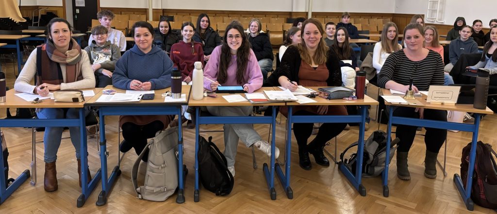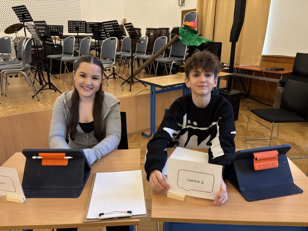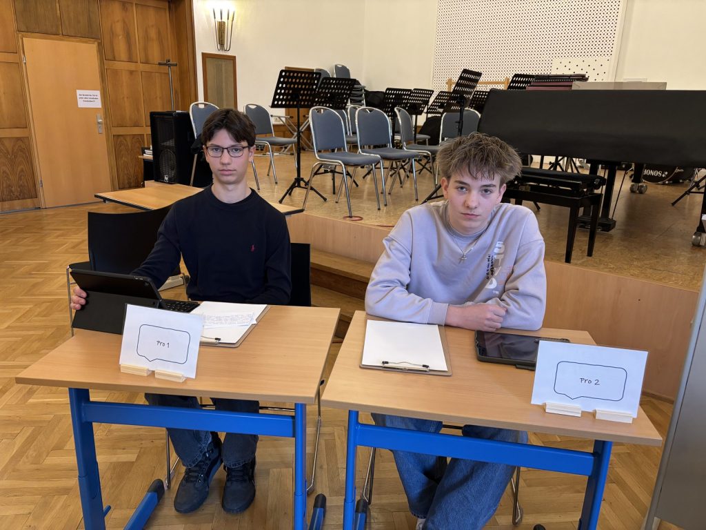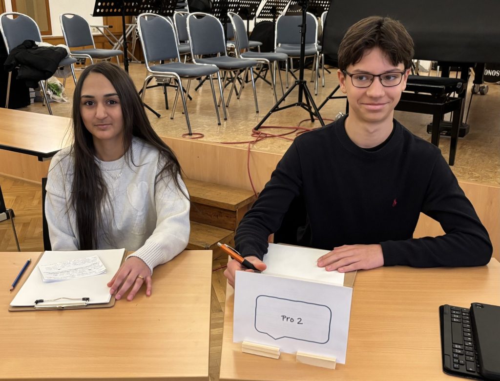 In der EF-Debatte diskutierten Marie Felbeck und Jannick Treute (Pro) sowie Maxim Shcherbakov und Celine Ronge (Contra) die Frage, ob Abschlussprüfungen digital statt handschriftlich verfasst werden sollten. Die Pro-Seite überzeugte mit guter Vorbereitung, vielfältigen Argumenten sowie Zahlen und Beispielen. Die Contra-Seite hingegen brachte praxisnahe Einwände, Alltagsbeispiele und kritische Nachfragen ein, wodurch eine lebhafte und ausgewogene Diskussion entstand.