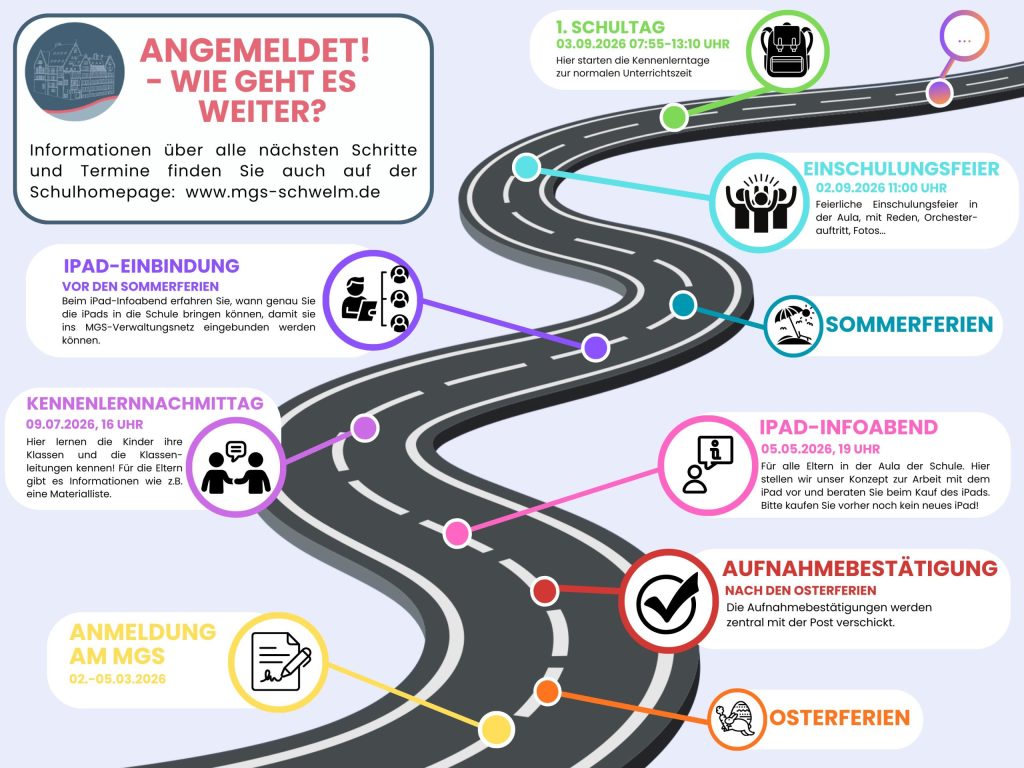 Alle Schülerinnen und Schüler, die zum Schuljahr 2026/267 am MGS aufgenommen werden, benötigen ein elternfinanziertes iPad, um am Unterricht teilnehmen zu können. Alle Infos dazu bekommen Sie bei der Anmeldung. Bitte besorgen Sie vorerst kein Gerät speziell für den Schulbesuch sondern warten die Informationen ab.