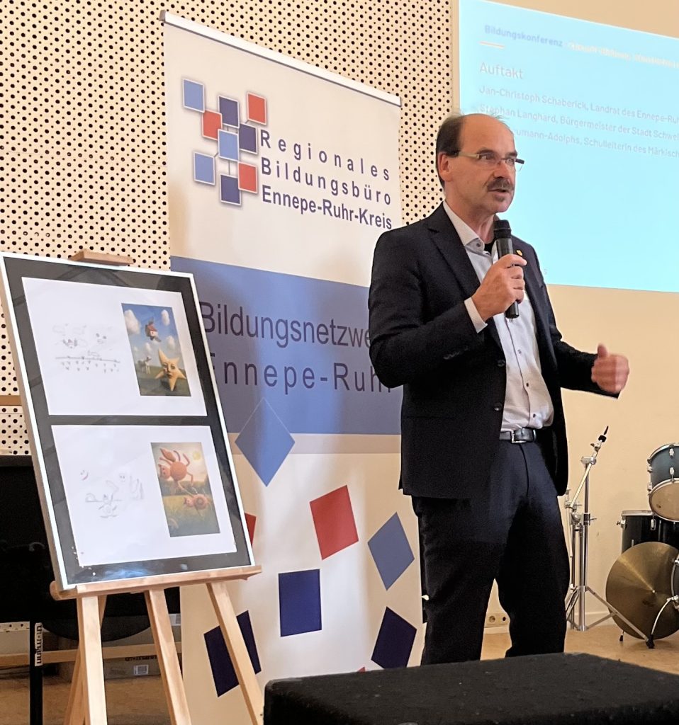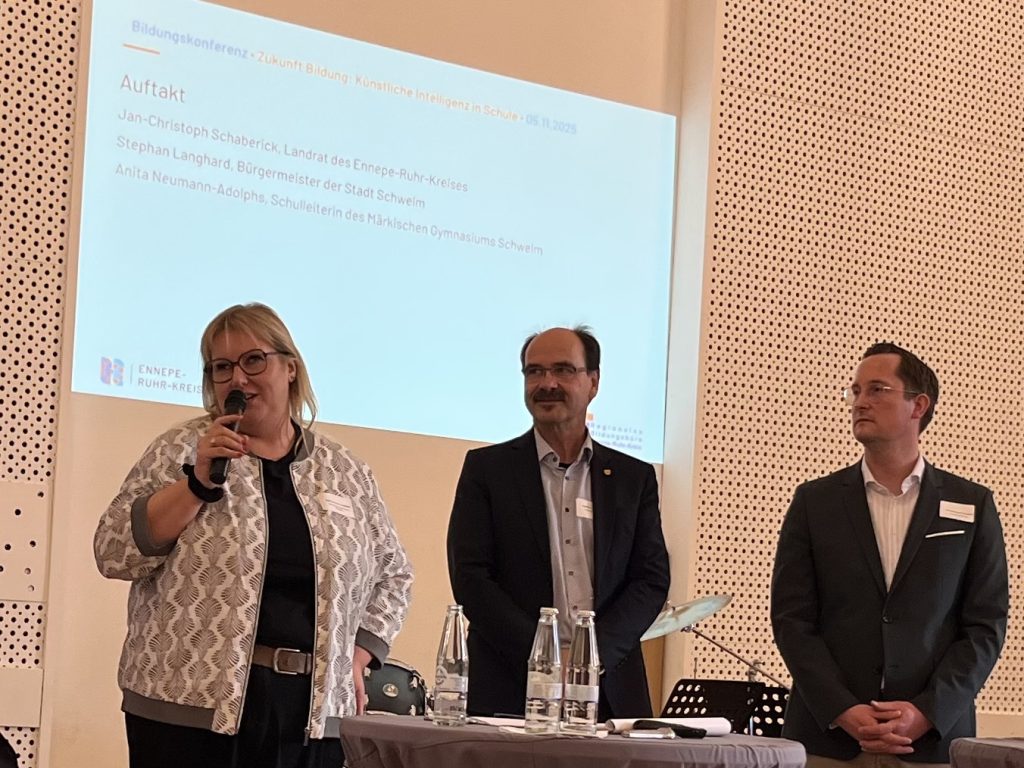 Den Auftakt der Konferenz bildete ein Eröffnungstalk mit dem Landrat Jan-Christoph Schaberick, dem Bürgermeister der Stadt Schwelm, Stephan Langhard, sowie der Gastgeberin Anita Neumann-Adolphs, der Schulleiterin des Märkischen Gymnasiums Schwelm. Schaberick hob in seinem Beitrag hervor, dass die digitale Transformation der Schulen nicht nur eine technologische Herausforderung sei, sondern auch eine Chance, das Bildungssystem für die Zukunft fit zu machen: „Künstliche Intelligenz ist keine Science-Fiction mehr, sondern ein praktisches Werkzeug, das die Lehr- und Lernprozesse nachhaltig verbessern kann.“