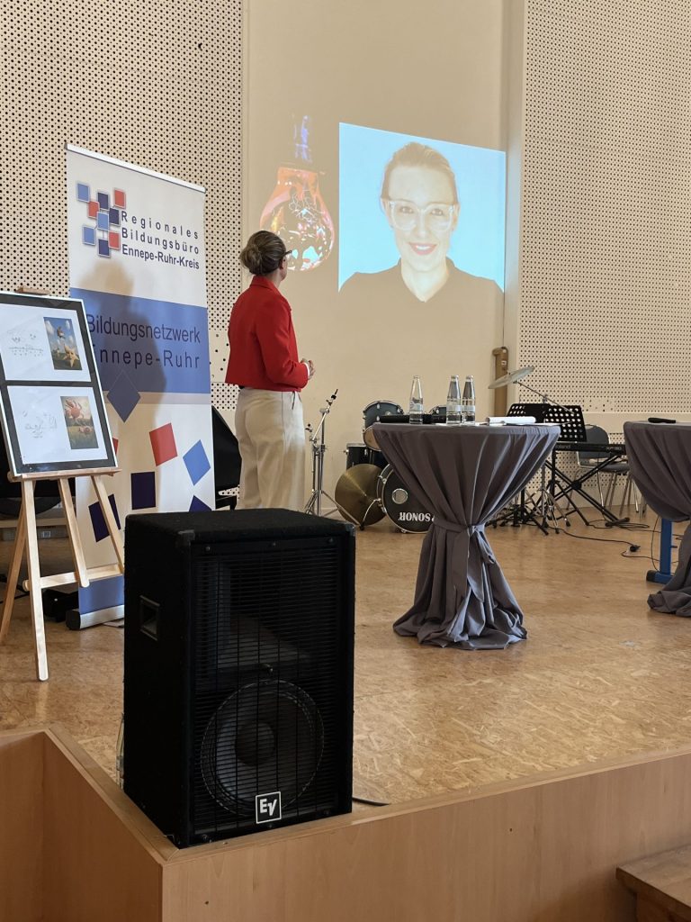 Stephan Langhard betonte die Rolle der Stadt als aktiver Partner in der Digitalisierung der Schulen und die Wichtigkeit der Zusammenarbeit zwischen Kommunen und Schulen. „Es muss sichergestellt werden, dass die Schulen mit der richtigen digitalen Infrastruktur ausgestattet sind, um KI sinnvoll einzusetzen“, so Langhard. Frau Neumann-Adolphs verwies in dem Zusammenhang auf das Kunstprojekt „BRING IT TO LIFE“ der Jahrgangsstufe 12, das veranschaulicht, wie KI beispielsweise im Kunstunterricht genutzt werden kann. Die entstandenen Kunstwerke der Schülerinnen und Schüler rahmten als Ausstellung die Konferenz.