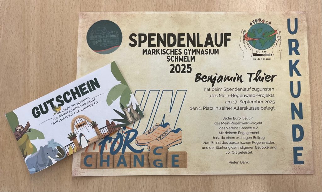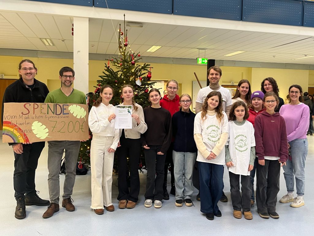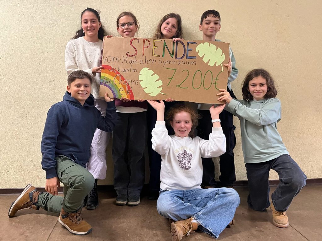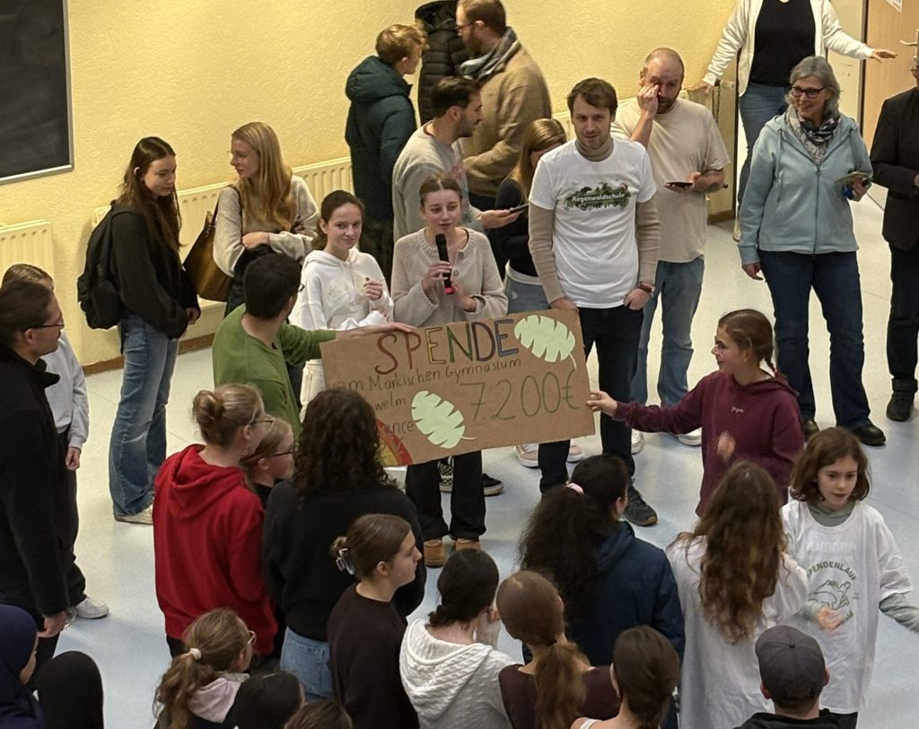 Auch in diesem Jahr konnten die Mitglieder der Klima-AG zusammen mit ihren Lehrkräften Christian Satalik, Marius Bergmann und Theresa Buhr einen symbolischen Scheck an Christian Meißner vom gemeinnützigen Verein Chance e.V. überreichen. Mit dem Geld wird das Projekt Mein Regenwald unterstützt, dessen Ziel der Erhalt des peruanischen Amazonas-Regenwaldes sowie die Stärkung der indigenen Bevölkerung sind.