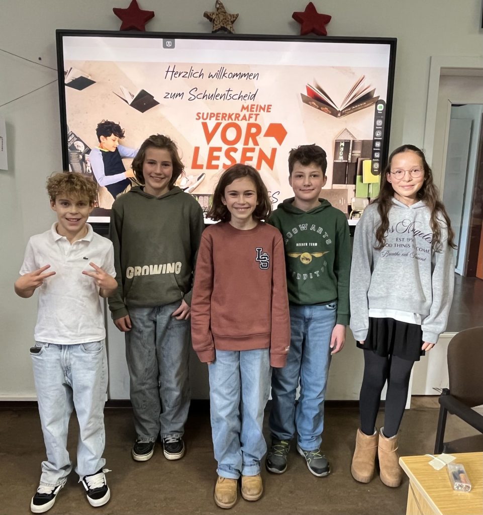 Nach kurzer Beratung sprach die Jury den ersten Platz und damit auch die Teilnahme am Regionalwettbewerb einstimmig Emil Baumeister aus der Klasse 6a zu. Emil überzeugte durch einen überaus lebendigen, geradezu mehrstimmigen Vortrag, eine engagiert begründete Textauswahl, die Lust auf das Buch macht, sowie die beeindruckende Fähigkeit, auch den unbekannten Text aus dem Stand heraus geradezu wie ein Hörspiel umzusetzen. Der zweite Platz ging an Emilia Däumer, über den dritten Platz auf dem Siegertreppchen darf sich Nino Bäcker freuen.