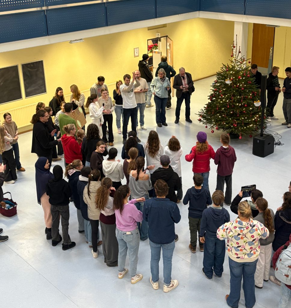 Der Chor unter der Leitung von Musiklehrerin Maike Reichert lädt zum Adventssingen unter dem festlich geschmückten Weihnachtsbaum ein.