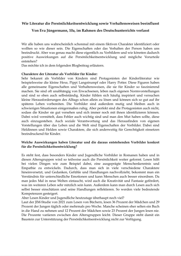 Als Ergänzung zum Vorlesetag veröffentlichen wir daher zwei Texte von Eva Jüngermann und Rebecca Kafke aus der Klasse 10a, die zeigen, wie Lesen weit über den Moment des Zuhörens hinauswirkt – nämlich als Anstoß für Selbstreflexion, Persönlichkeitsentwicklung und eine offene, wertschätzende Haltung gegenüber anderen.