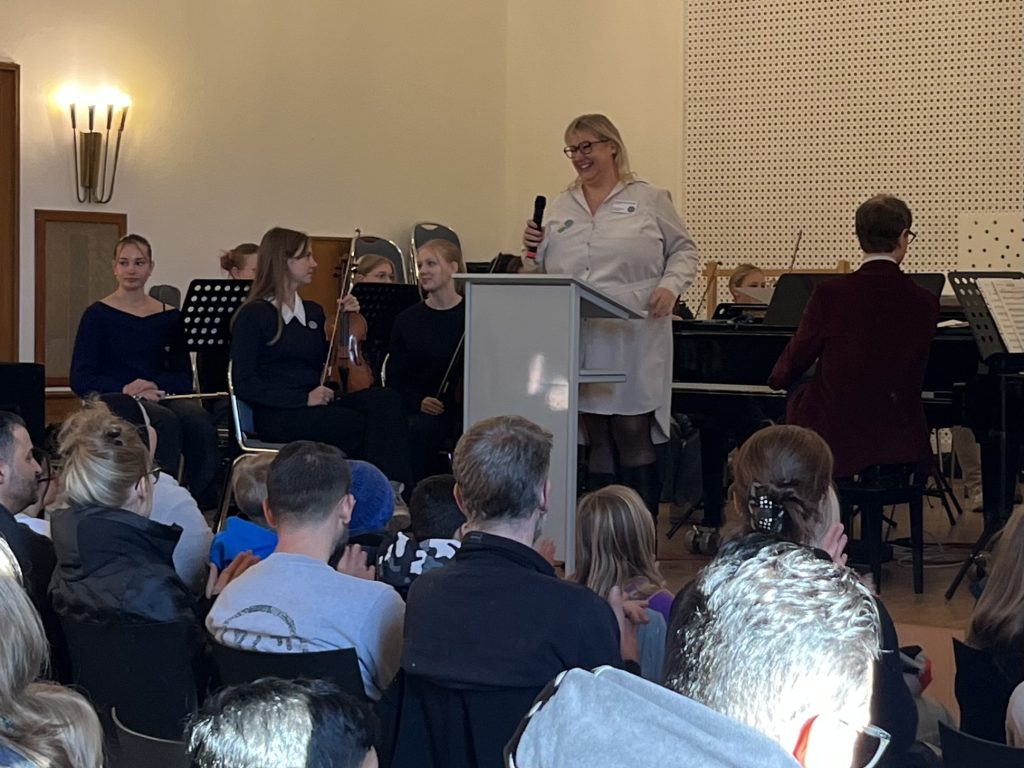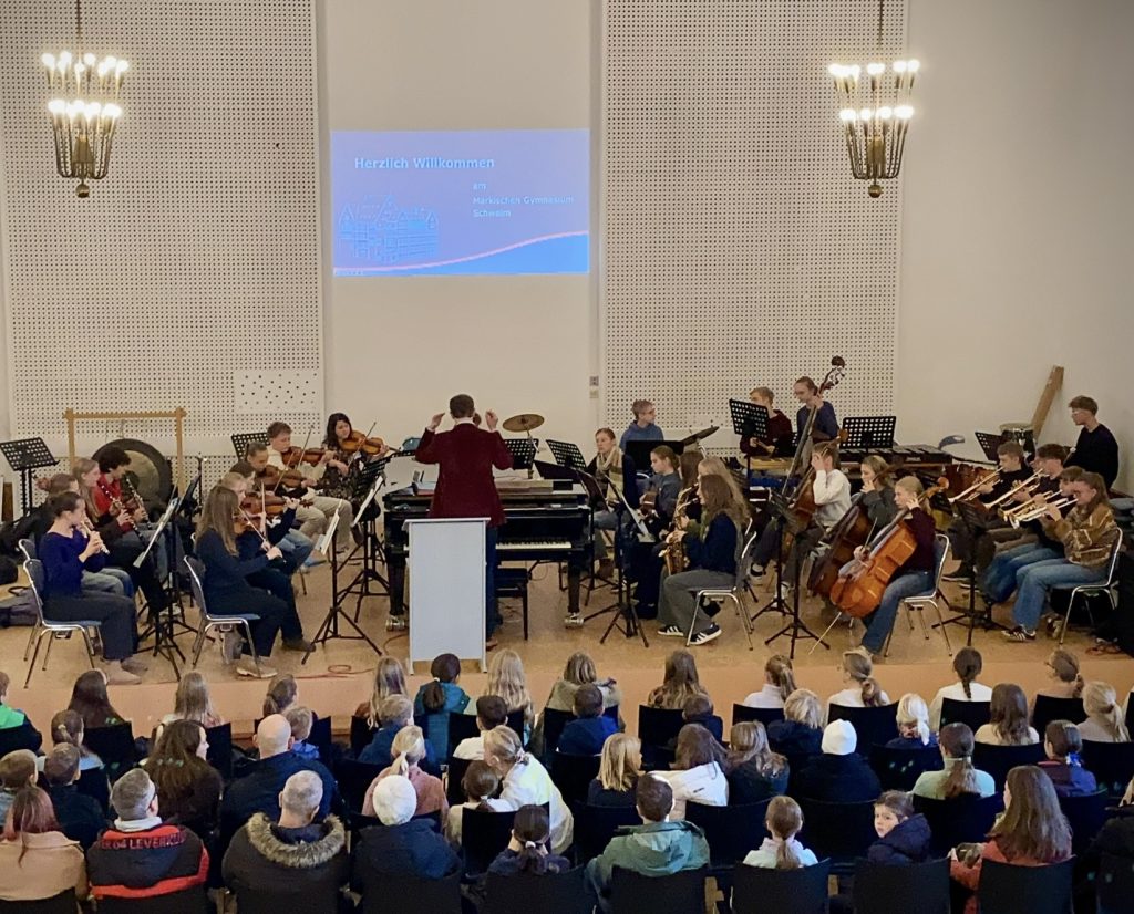 Wie schon im letzten Jahr begrüßte Schulleiterin Anita Neumann-Adolphs innerhalb zweier Zeitfenster interessierte Viertklässlerinnen und Viertklässler und deren Eltern zu Beginn des Info-Tages sehr herzlich in der Aula des Gymnasiums. Erprobungsstufenkoordinatorin Charlotte Buch informierte über Inhalte und Organisatorisches in der Stufe 5 mit Ausblick auch auf Stufe 6 und lud mit ihrem Team herzlich ein, das Gymnasium näher unter die Lupe zu nehmen. Unter der Leitung von Henrik Weiß brachte das Schulorchester Kostproben aus dem diesjährigen Repertoire zu Gehör.