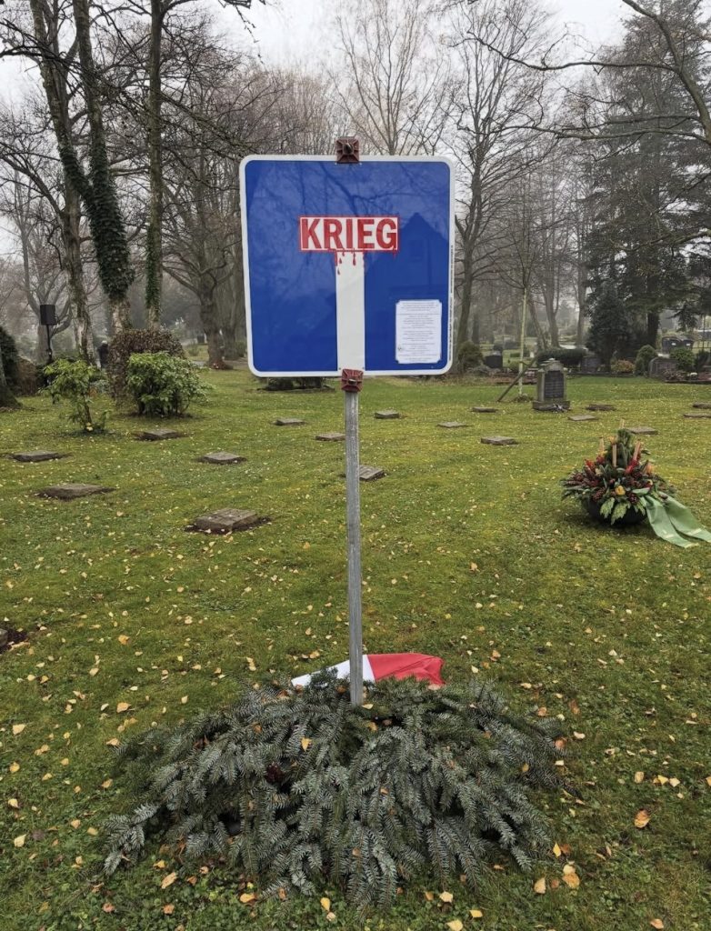Schülerinnen und Schüler des katholischen Religionskurs der Stufe EF des Märkischen Gymnasiums riefen mit einer temporären Kunstinstallation zum Nachdenken über Frieden, Gerechtigkeit und Toleranz auf. Mit der Enthüllung eines „Verkehrsschildes der Gerechtigkeit“ auf dem Gräberfeld setzten sie ein sichtbares Zeichen gegen Krieg und für Erinnerung, Hoffnung und eine friedliche Zukunft. Die Aktion beruht auf einer Zusammenarbeit mit dem Künstler Johannes Volkmann und seinem Kunst-Projekt „Verkehrsschilder der Gerechtigkeit“, das derzeit in der ganzen Bundesrepublik von Schulen und anderen öffentlichen Institutionen weitergetragen wird. Das Gymnasium zeigt anschaulich: KRIEG IST EINE SACKGASSE.
