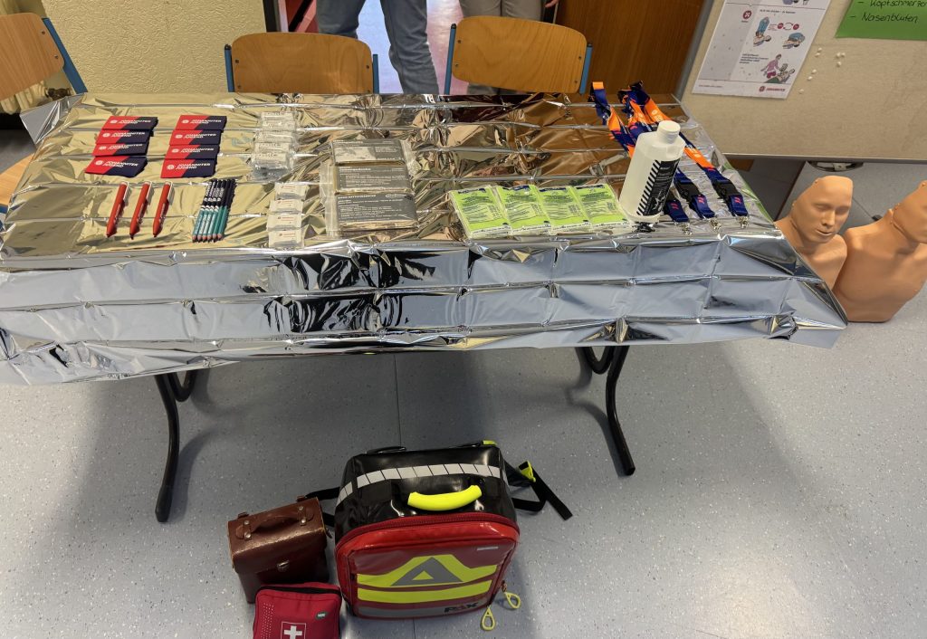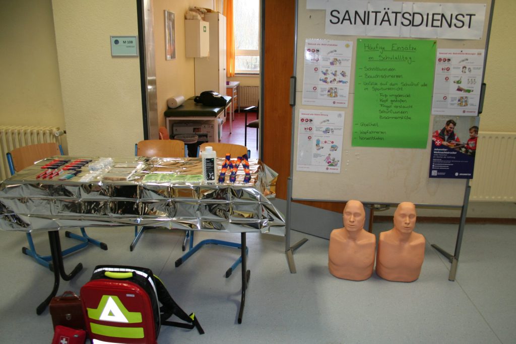 Die Schülerinnen und Schüler vom Sanitätsdienst helfen verletzten Kindern. Die Schülerinnen und Schüler werden per Handy aus dem Unterricht zu Notfällen gerufen und verbringen auch nach Dienstplan ihre Pausen im Sanitätsraum.