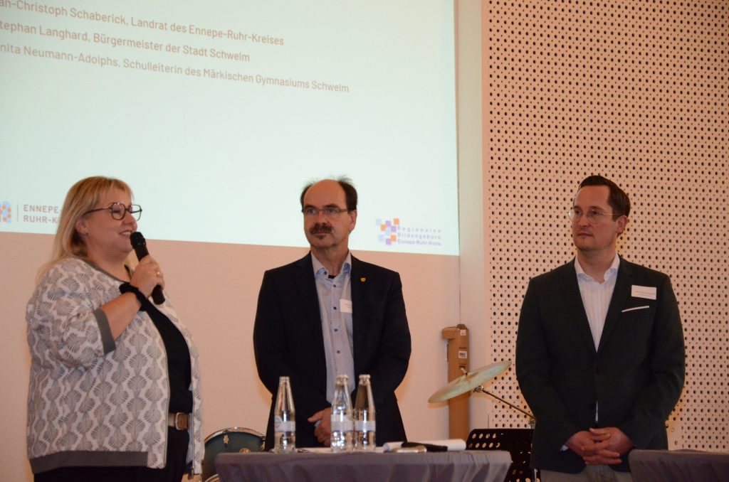 Den Auftakt der Konferenz bildete ein Eröffnungstalk mit dem Landrat Jan-Christoph Schaberick, dem Bürgermeister der Stadt Schwelm, Stephan Langhard, sowie der Gastgeberin Anita Neumann-Adolphs, der Schulleiterin des Märkischen Gymnasiums Schwelm. Schaberick hob in seinem Beitrag hervor, dass die digitale Transformation der Schulen nicht nur eine technologische Herausforderung sei, sondern auch eine Chance, das Bildungssystem für die Zukunft fit zu machen: „Künstliche Intelligenz ist keine Science-Fiction mehr, sondern ein praktisches Werkzeug, das die Lehr- und Lernprozesse nachhaltig verbessern kann.“