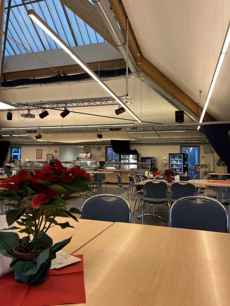 Heute wurde der Tannenbaum im Atrium aufgestellt. In diesem Jahr schmückten Schülerinnen und Schüler der EF den Baum mit Lichterketten und zahllosen roten Weihnachtskugeln. Man merkt gleich, dass von ihnen wohl auch Zuhause nicht zum ersten Mal ein Tannenbaum festlich dekoriert wurde.