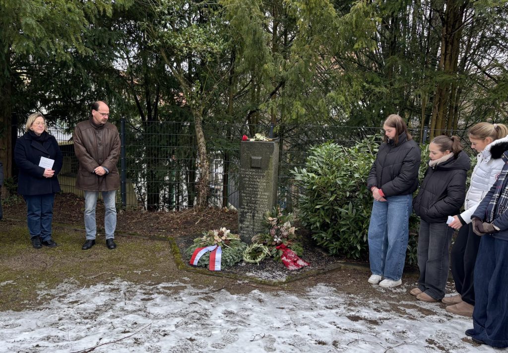 Kranzniederlegung zur Holocaust-Gedenkfeier mit Bürgermeister Stephan Langhard, den beiden Leiterinnen der AG Lokalgeschichte/Stolpersteine und Schülerinnen der Klasse 10d.
