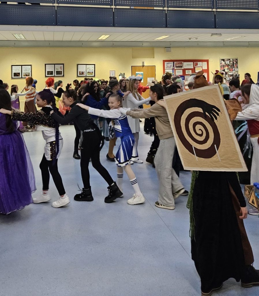 Im Atrium kam wie immer richtig Stimmung auf. Eine lange Polonaise zu den aktuellen Karnevalskrachern durch das ganze Schulgebäude sorgte für großen Spaß und Gelächter.